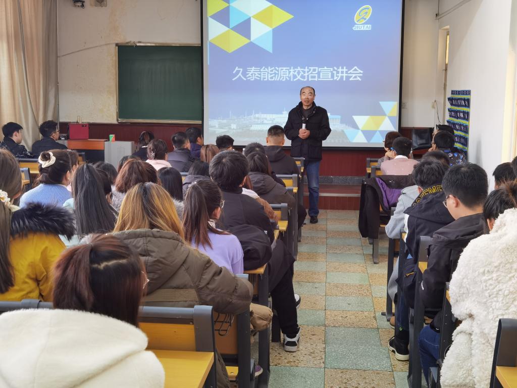 化学学院院长魏兵老师主持,副书记冯丽老师出席了此次招聘会。辅导员丁瑞丽老师组织了本次招聘会。会上公司人力专员王爱虹为同学们播放了久泰能源内蒙古有限公司的宣传片并通过互动等形式与同学们相互交流,沟通,充分了解同学们的具体情况,也让同学们了解公司的发展前景。最后,工作人员通过生动的演讲使同学们对久泰能源内蒙古有限公司有了更深的认识,对自己的人生目标有了新的想法。
