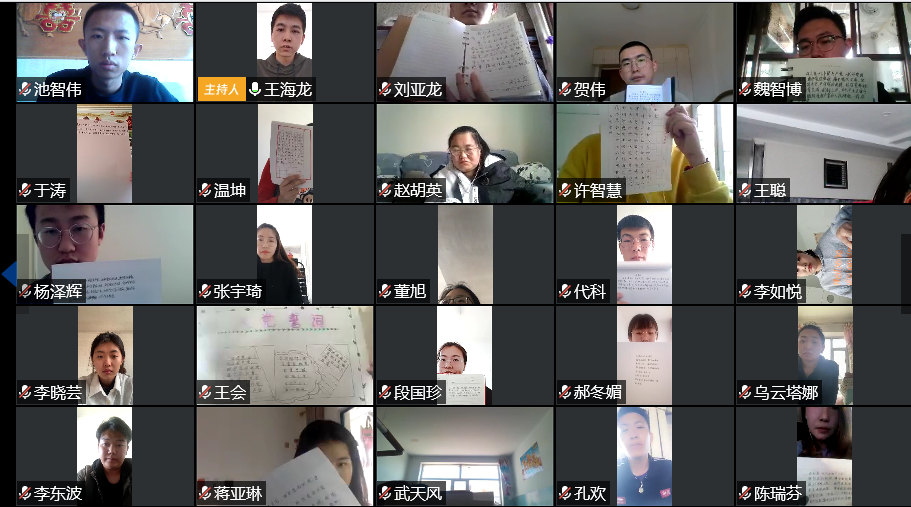 北京大学援鄂医疗队的“90”后党员用实际行动体现了作为党员的忠诚与担当,他们把所学所知挥洒在祖国和人民最需要的地方,为了国家与人民,冲锋在前,不惧艰险,也终于不负使命,不负重托,让青春在党和人民最需要的地方绽放绚丽之花。他们的精神使与会党员深受感染和鼓舞,于是支部党员同志们饱含热情的用书法重温入党誓词,并在屏幕前相互展示了自己的作品,最后全体与会党员起立,高举右拳,进行了庄严的宣誓。