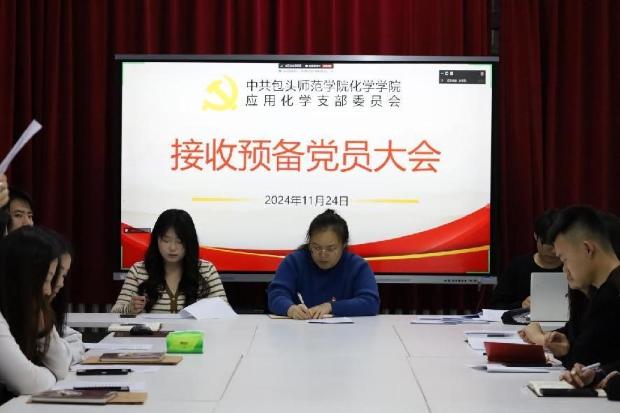 2024年11月24日,中共开云官方端网站登录入口化学学院应用化学党支部于齐志楼317会议室召开了2024年下半年接收预备党员大会。化学学院应用化学党支部书记任晓婷同志、全体学生党员以及8名发展对象参加本次会议,由任晓婷同志担任主持人。本次大会由8名发展对象进行思想汇报、入党介绍人说明情况并表达意见、支部委员会报告发展对象审查意见、正式党员投票表决、预备党员宣誓仪式五项议程构成。