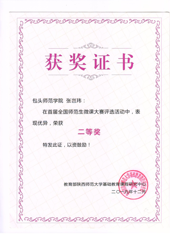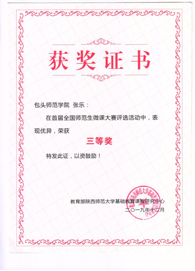 全国师范生微课大赛评比结果于近日揭晓,东北师范大学、陕西范大学、重庆师范大学等93所高校参与了微课制作竞技,共计1432份作品进入到全国决赛,最终评选出特等奖37名、一等奖100名,二等奖200名,三等奖300名,优秀奖653名。我校选送的化学教育2018级三名学生全部获奖,其中张岂伟同学的微课作品荣获二等奖;张乐同学的微课作品荣获三等奖;梁丹同学的微课作品荣获优秀奖。获奖的3项微课作品均由化学学院教师张玉恒老师指导。