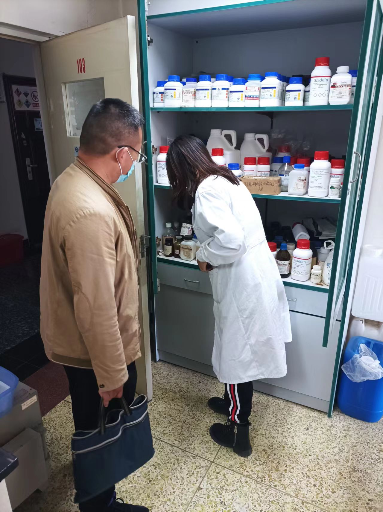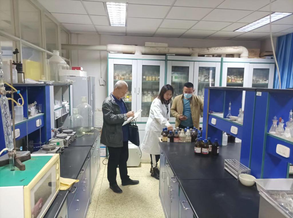 主要排查了基础实验室、科研实验室各种危化品、易制毒等存放、领用及使用明细记录情况,检查出问题现场立即通知实验室负责人,限期要求整改。同时实验室主任雍胜利老师把检查出的问题都一一进行了记录,做好备查整改落实情况,切实做好实验室各项安全管理工作,保障师生安全和校园安全。