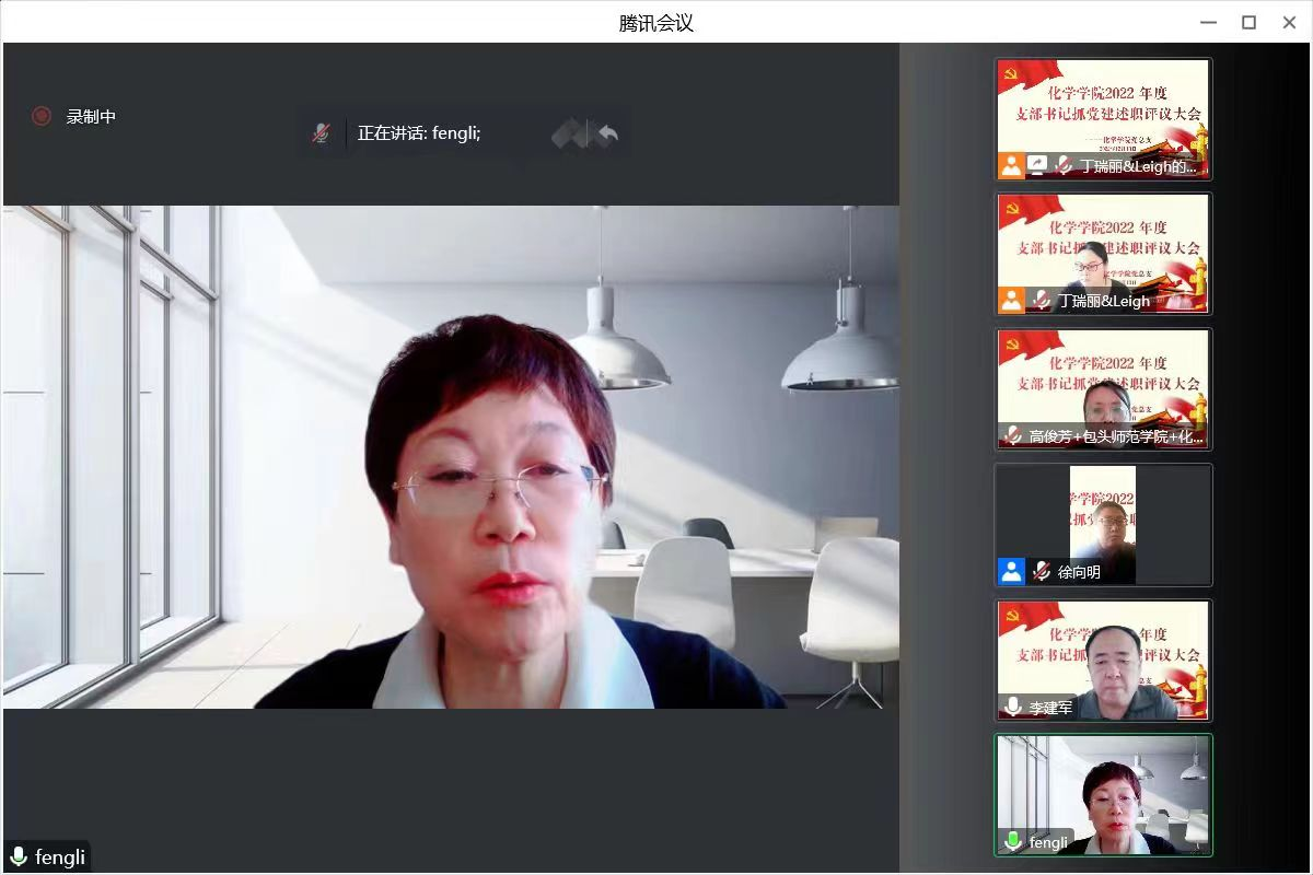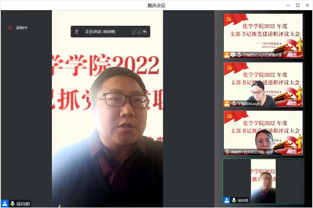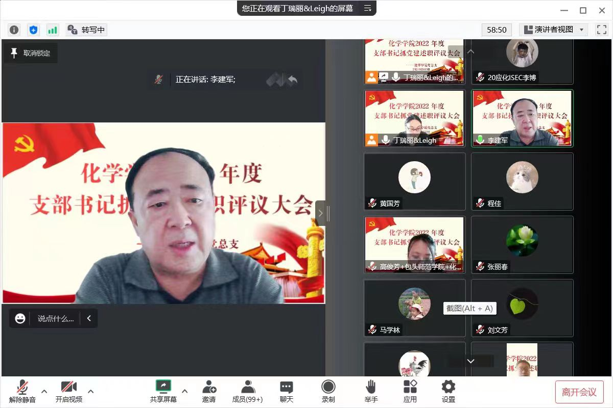 根据《党委组织部关于做好2022年度党组织书记抓基层党建述职评议考核工作的通知》要求,化学学院党总支于2022年12月13日下午15:00在腾讯会议召开党支部书记抓党建述职评议大会。化学学院党总支委员、各党支部书记、全体教工党员教师和学生党员参加了会议。会议由党总支书记李建军主持。
