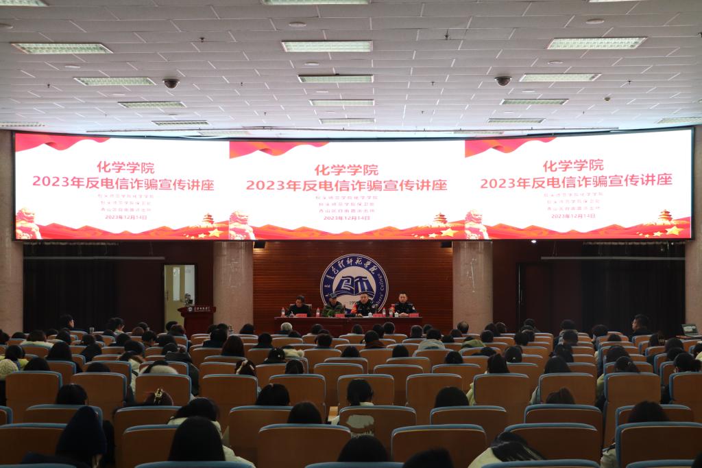 2023年12月14日下午化学学院反电信诈骗讲座成功举办,此次讲座旨在提高广学生对电信网络诈骗的防范意识和能力,以保护自身财产安全。参加本次讲座的有各班班主任、全体辅导员及化学学院全体学生。本次讲座由化学学院党总支副书记高俊芳老师主持。