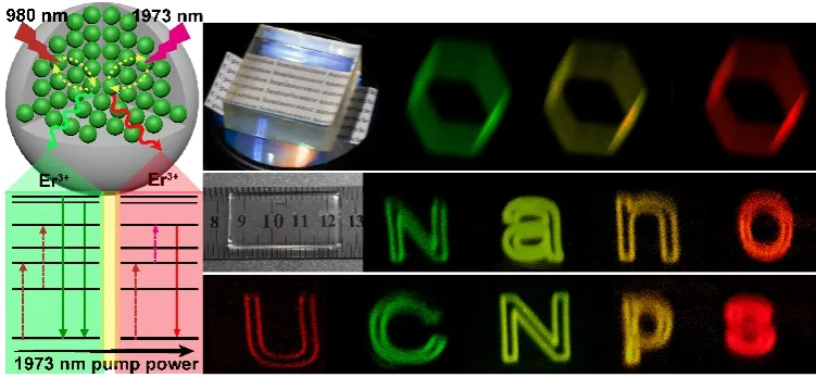 此外,研究团队提出不需要多个稀土离子,利用980/1973 nm耦合激光协同激发的方式调控单一Er3+稀土离子的激发态布局路径来实现多色可调上转换发光的新方法,并研究这种调控方法在彩色三维显示领域的应用潜力(图2)。相关研究成果以Multicolor Tunable Upconversion Luminescence via Near-Infrared Manipulation of Population Pathways of Er3+ Ions Excited-State Levels for Volumetric Color Displays为题发表于《Advanced Optical Materials》期刊 (https://doi.org/10.1002/adom.202302583)。