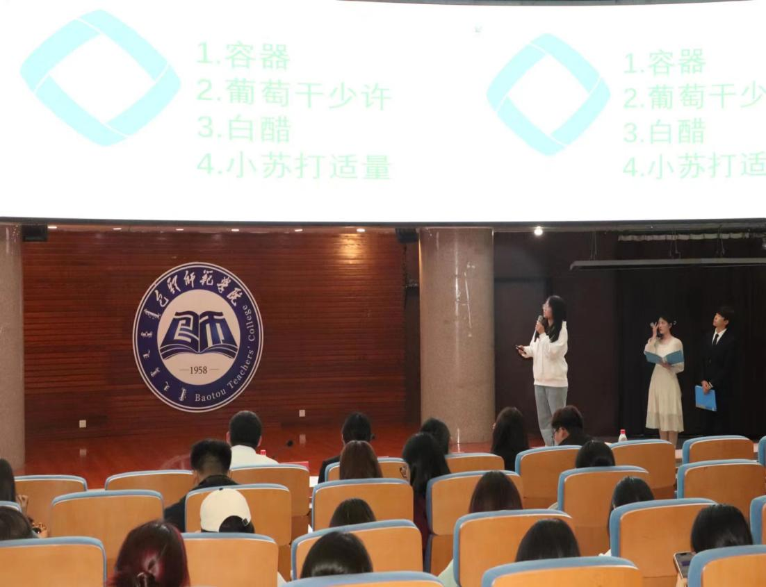 担任此次大赛的评委分别为化学学院王沙老师、武凤霞老师、校学生会执行主席范玉晖、历史文化学院执行主席赵烨鑫、物理科学与技术学院执行主席张浩。本次实验技能大赛决赛非专业组的参赛选手来自不同学院,通过初赛的选拔共有12支参赛队伍晋级决赛。决赛现场气氛热烈,选手们紧张而充满激情的展示着自己的化学知识。本次比赛分为两个环节。第一环节,选手比拼:参赛选手进行实验视频展示及相关PPT讲解;第二环节,观众互动:主持人提问相关化学知识观众进行抢答,抢答成功的同学可获得精美小礼品一份。