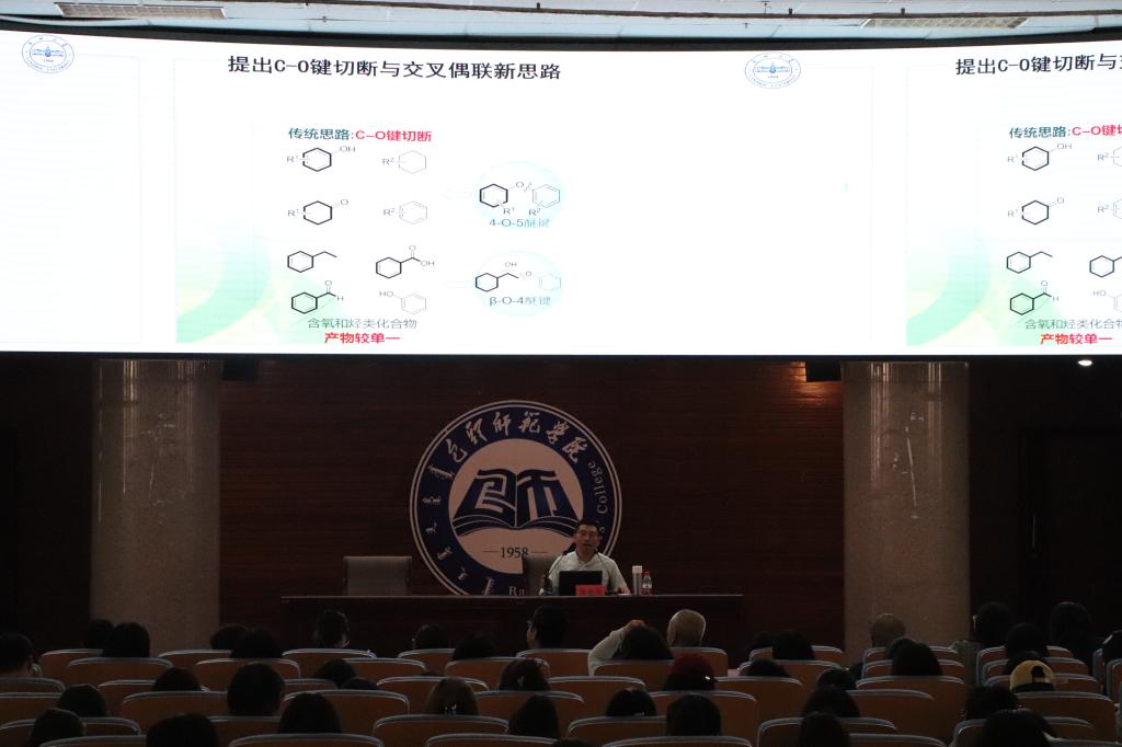随后,曾教授结合自身的研究方向以“可再生木质素资源降解与光能利用”为题为与会师生作了高水平学术报告。从创新思维和绿色化学的角度入手,结合团队的科研经历以及近年来取得的各项重大成果,对木质素降解和光能利用进行了详细介绍。曾教授团队以“醚键切断是解决木质素降解的关键科学问题”为核心,以木质素结构上的多种醚键的为抓手,提出了“去芳香化-重新芳香化”的醚键断裂新思路,为解决木质素降解这一科学难题提出了新的可行路径。曾会应教授对前沿科学的精准把握、对创新思维的深邃思考,给参会人员留下了深刻印象,为参与讲座的同学和从事相关专业科研工作的教师指明了创新和努力的方向。