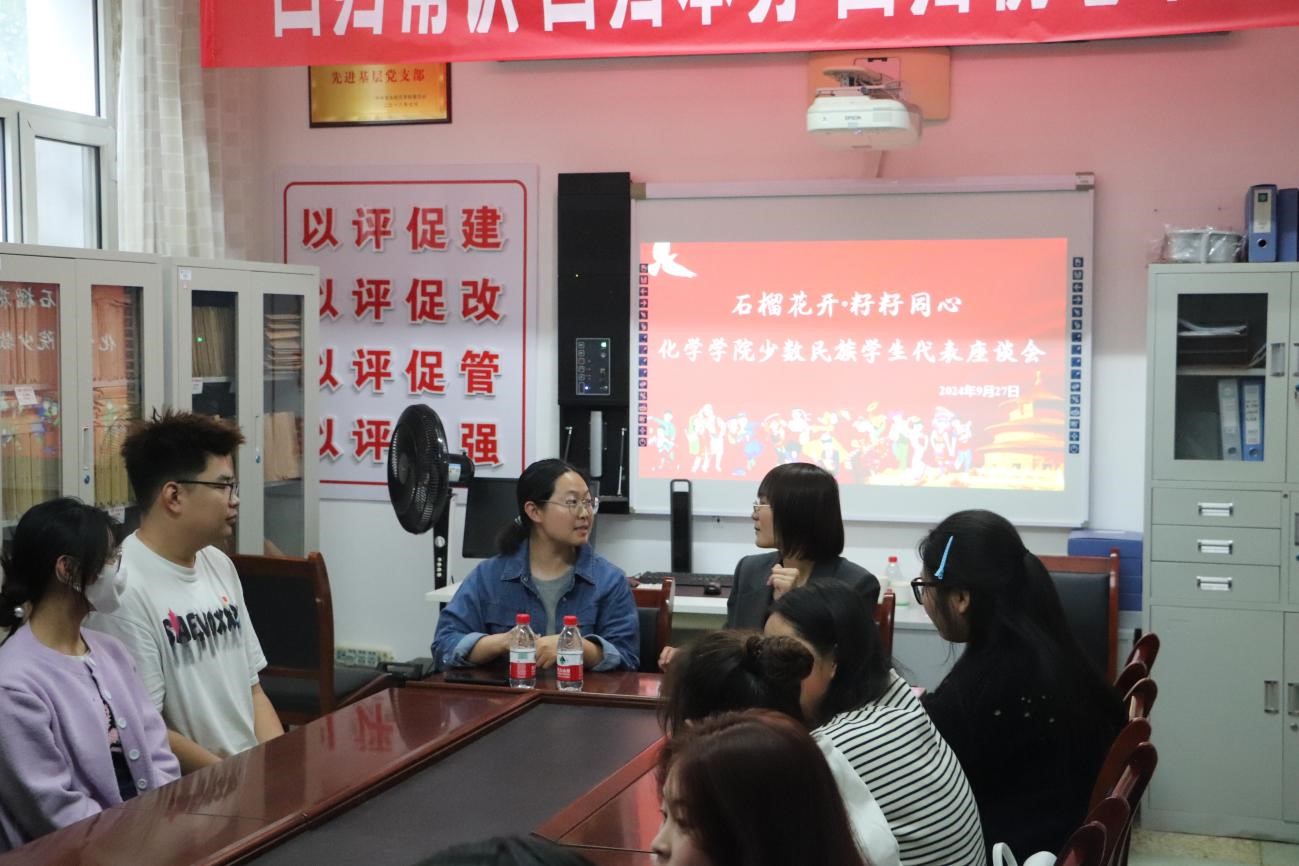 为深入学习贯彻党的二十大精神,铸牢中华民族共同体意识,促进各民族学生交往、交流、交融,传递校园温暖,我院于9月27日下午,在齐志楼320组织召开“石榴花开・籽籽同心”化学学院少数民族学生座谈会。