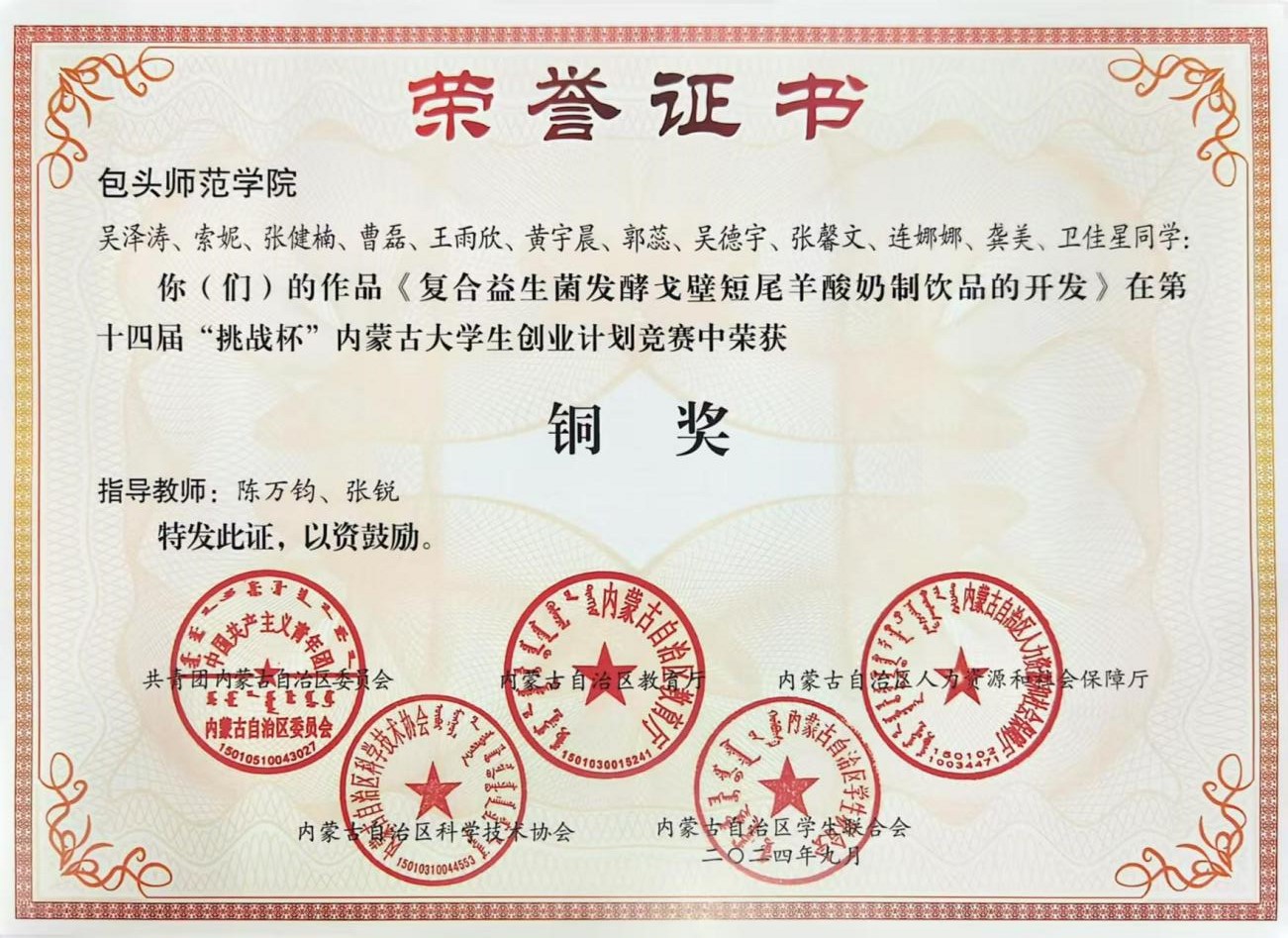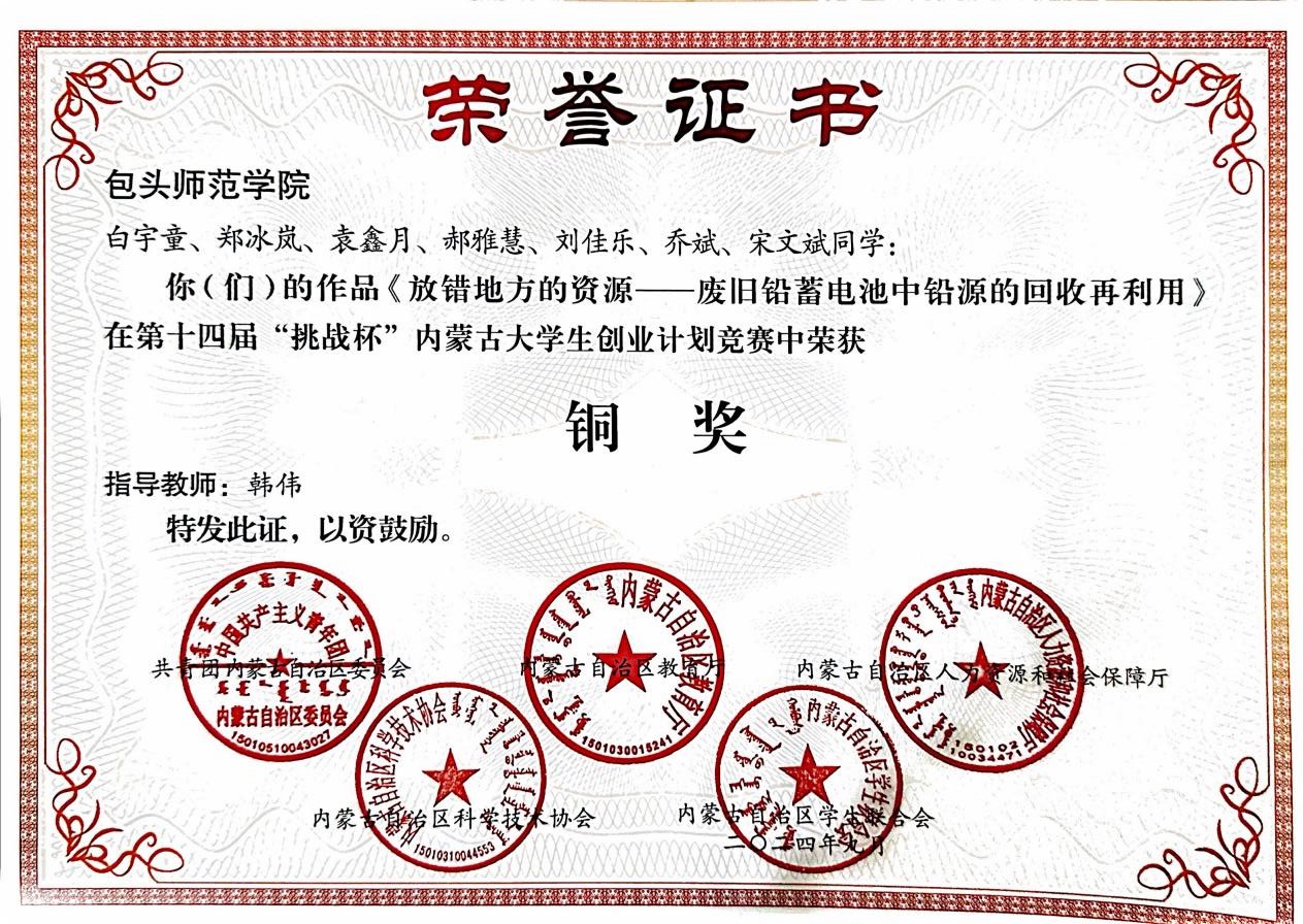 最终,化学学院师生在7月2日——3日的第十四届“挑战杯”内蒙古大学生创业计划竞赛终审决赛金银奖争夺赛中,我院共荣获省级铜奖三项!