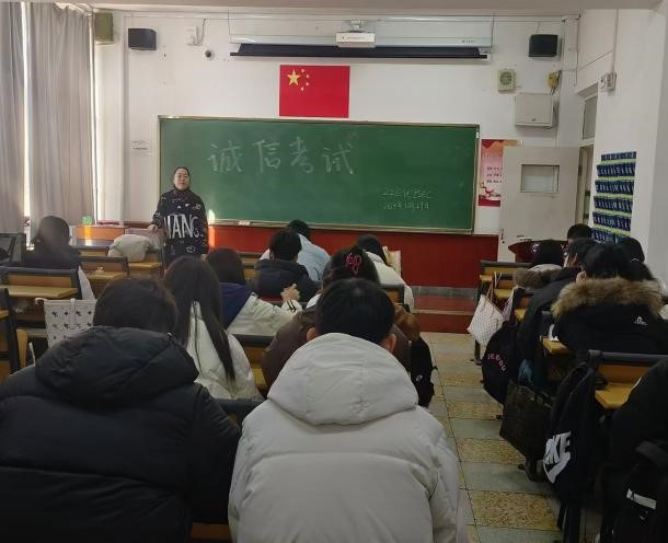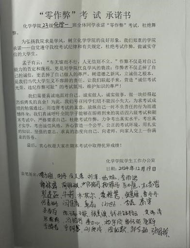 为了加强学院学风建设,弘扬诚信考试的优良风气,2024年12月底考试周之前,我院组织各班学生召开考风考纪主题班会并签订《“零作弊”考试承诺书》。