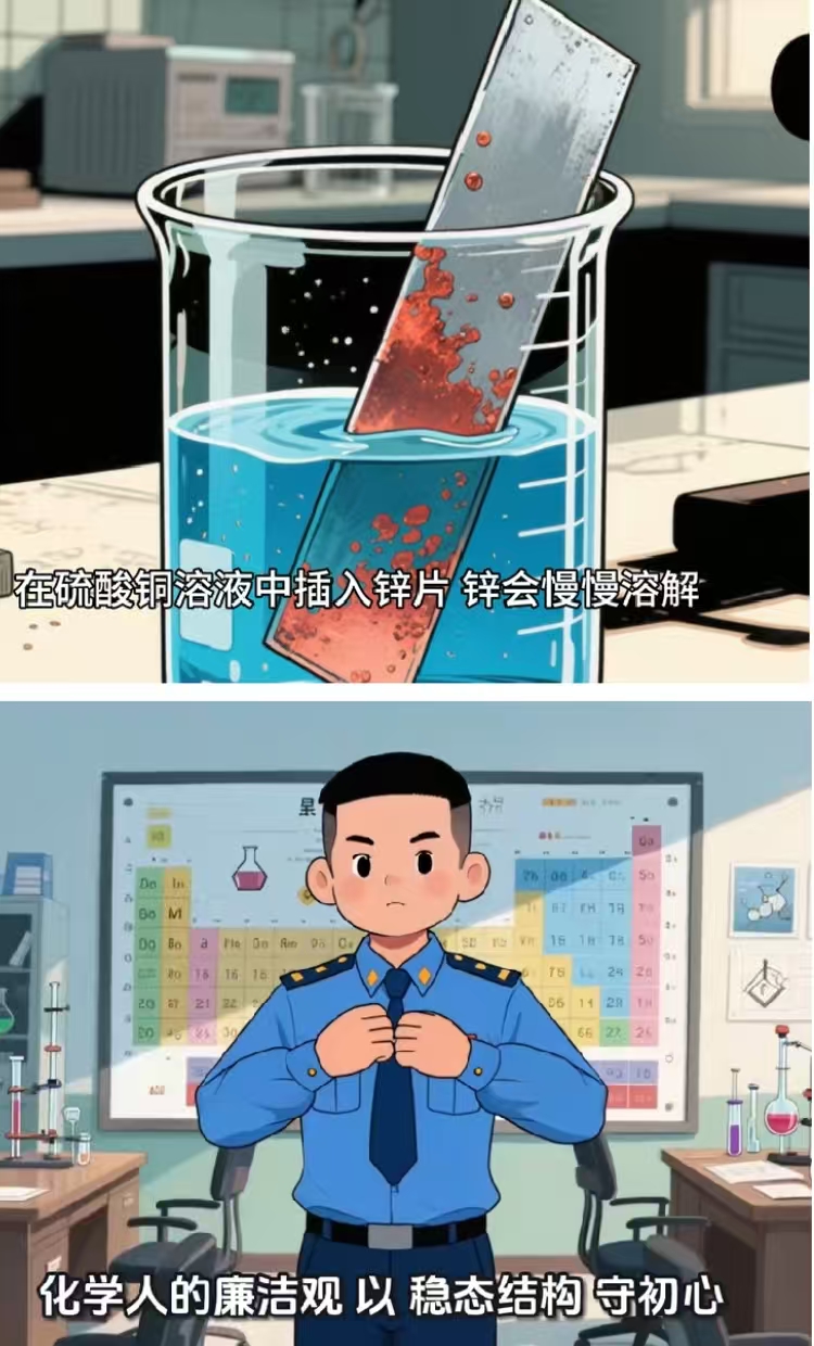 在视廉正行视频制作活动中,同学们结合专业特色,以化学实验诠释廉洁理念。其中,2023级王兴宇同学借助碘钟实验”的鲜明特性——透明溶液在精确计时后骤然变色,生动比拟廉洁自律需防微杜渐,一旦突破临界点即会发生质变2024级张暄敏同学设计氧化还原反应对比实验,铁离子在反应中的变价过程形象比喻为个人在利益诱惑面前能否“坚守本心,锈迹斑斑的试管与保持光洁的对照组形成鲜明视觉冲击。