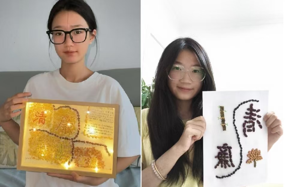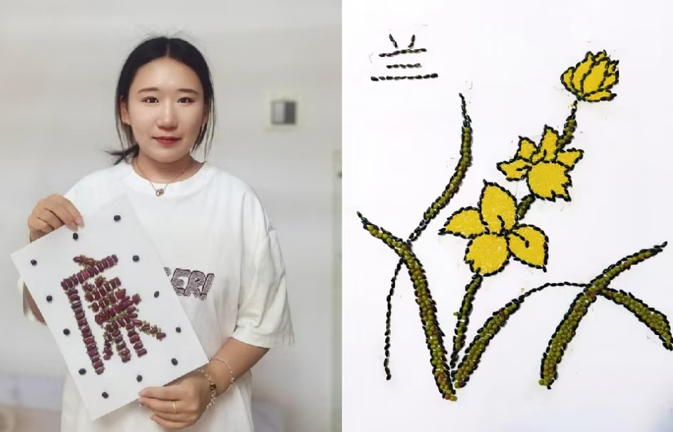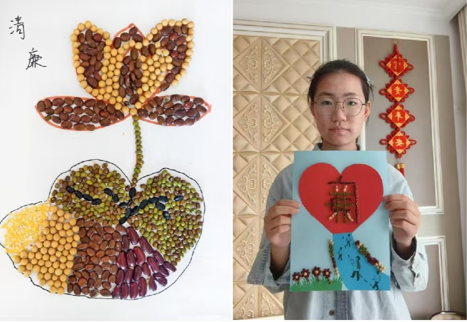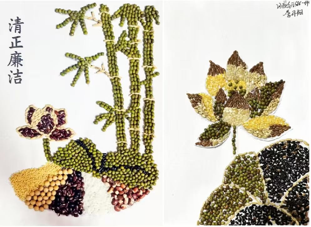 五谷绘清廉创意实践活动中,同学们充分发挥创意,以红豆、绿豆、小米等五谷杂粮为主要材料,辅以卡纸、胶水等工具,通过五谷粘贴画、廉洁主题拼贴和“廉”字造型等多种形式,将“清廉、正直、自律”的理念融入作品,创作出一系列主题鲜明、内容丰富的廉洁文化作品。2023级学生李丹阳细心调整豆粒位置时表示:“每一粒粮食都要摆正位置,如同做人要堂堂正正。”
