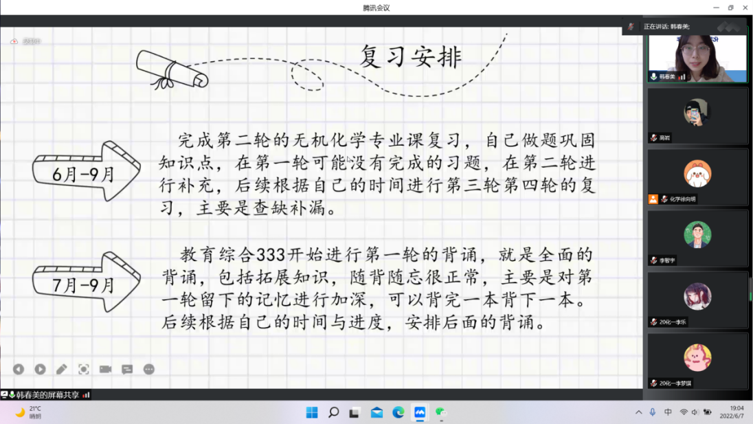 为了让大家全方位,多层次,宽领域地了解考研相关信息,在交流会上张雪瑞老师和学长学姐们通过屏幕共享展示了自己如何收集备考资料、备战期间心态的调整、时间分配、合适院校专业选择等事项,并就备考中应对遇到问题的思路和办法进行了分享。