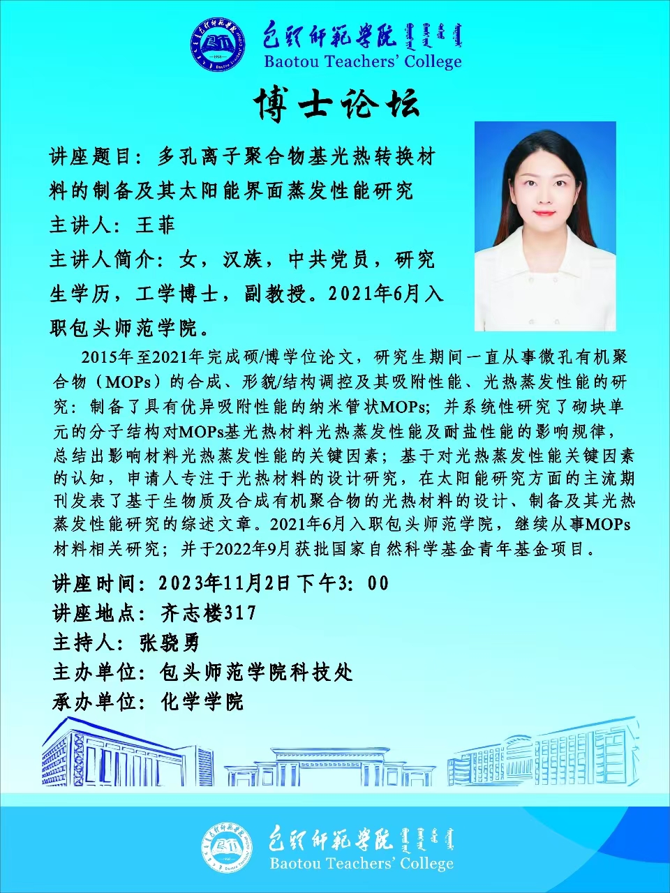 由科技处主办、化学学院承办博士论坛马上开讲,主讲嘉宾化学学院王菲博士,王菲博士毕业于兰州理工大学,主要研究方向是微孔有机聚合物(MOPs)的合成、形貌/结构调控及其吸附性能、光热蒸发性能的研究,欢迎教师、同学们参加。