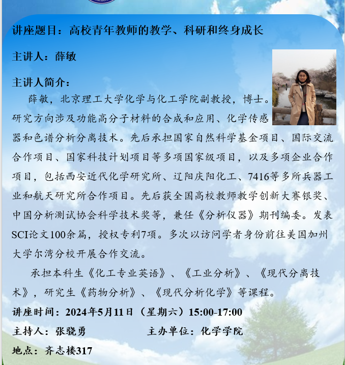 北京理工大学化学与化工学院薛敏副教授来我院进行教科研工作指导,欢迎广大教职工参加。