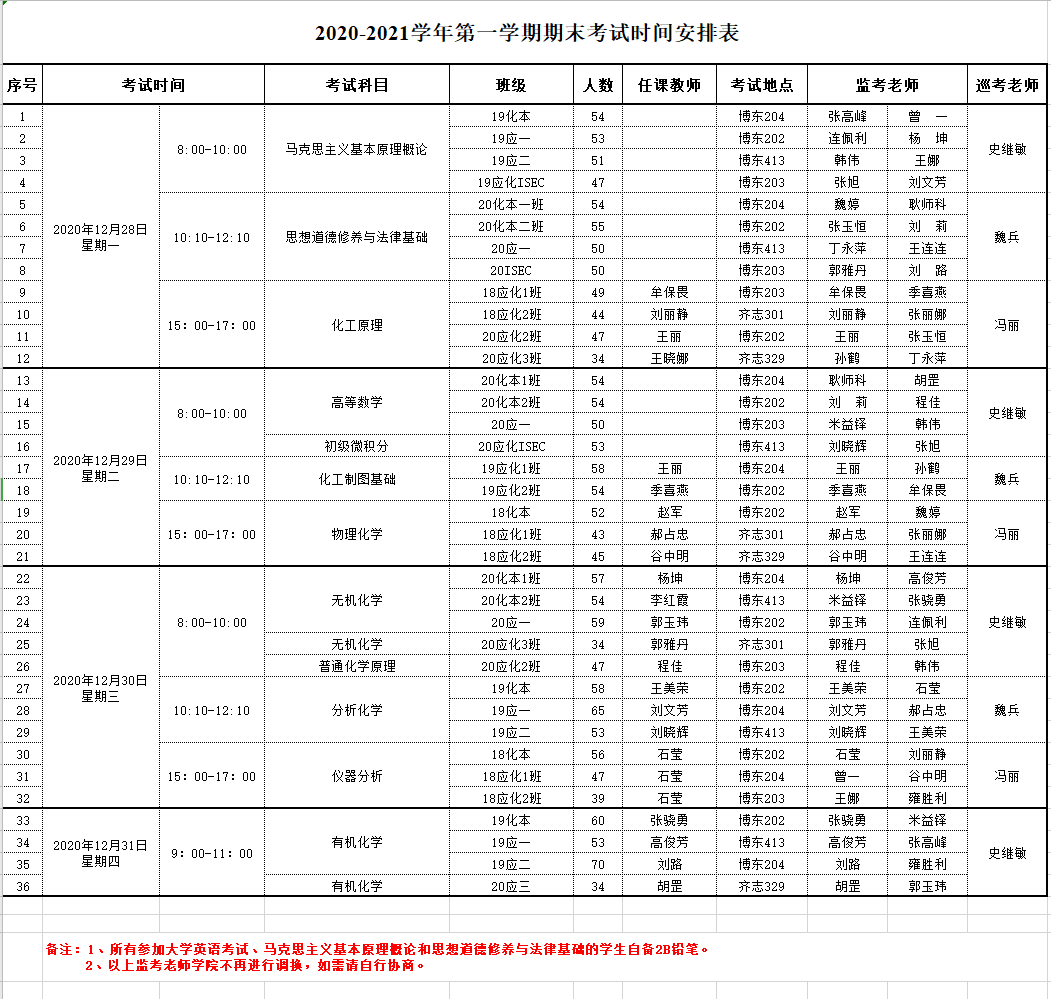 化学学院2020-2021学年第一学期期末考试时间安排2