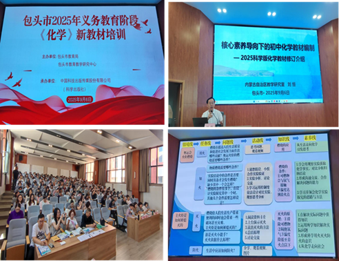 为深入贯彻新课标理念,精准把握义务教育化学学科新方向,助力全市初中化学教师全面理解新教材的修订思路与内容体系,2025年9月6日,由包头市教育局、包头市教育教学研究中心主办、中国科学出版社承办的“包头市2025年义务教育阶段《化学》新教材培训会”在包头市第二十九中教育集团青松校区顺利召开。我校化学学院派出化学教学论专业团队全程参与并进行专业支持,充分发挥高校在基础教育领域的引领与服务职能。