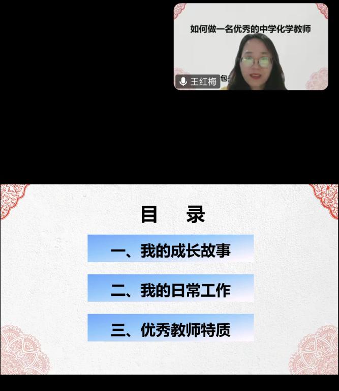 323包头市第五十一中学的王红梅老师带来了如何做一名优秀的中学化学教师”的讲座。由于王老师在阿拉善盟支教,因此此次讲座以线上的形式进行。王红梅老师结合自身的经历及工作实际,以提升核心素养为核心理念,为学生讲解了优秀中学化学教师应具备的素质。她将课堂分为课前、课中、课后三个阶段,并以这三个阶段为依据为学生详细的讲授了备课、上课、课后辅导的内容及方法,同时王老师还结合新课标展示了很多实验的改进案例。最后,王老师讲授了优秀教师的特质,为学生明确了未来努力的方向。