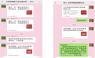 一、集中宣传助推“民族政策宣传月”活动。各项工作紧紧围绕铸牢中华民族共同体意识教育主线稳步推进。利用LED屏幕开展民族政策宣传工作,在班委微信群、“包师化学”公众号等推送民族政策知识学习的相关链接,全覆盖宣传党的民族政策,教育广大师生牢记习近平总书记的嘱托,全面贯彻落实党的民族理论和民族政策,深化民族团结进步教育工作,进一步激励全院师生为民族团结进步事业发展贡献力量,在全院上下营造了浓厚的教育氛围。