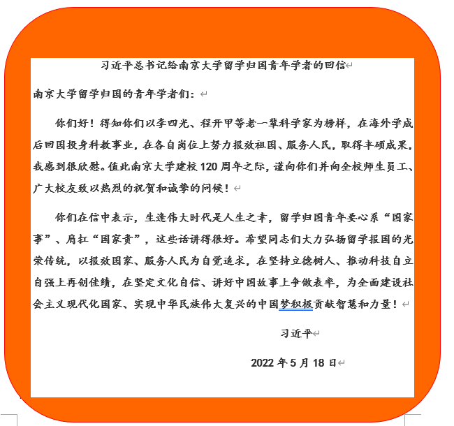习近平总书记5月18日给南京大学的留学归国青年学者回信,勉励他们在坚持立德树人、推动科技自立自强上再创佳绩,在坚定文化自信、讲好中国故事上争做表率。总书记的重要回信,饱含对南大师生员工的亲切关怀,饱含对留学归国青年学者和南大的殷切期望,为全国上下在新的征程上奋勇前行注入了强大精神力量。