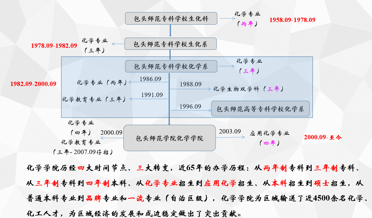 化学学院前身为化学系,创建于1958年,是我校设立最早的系科之一,2000年更名为化学学院。学院坚持面向包头市经济社会发展,围绕创建国家重要能源和战略资源基地,着力培养高素质应用型人才,对地方能源化工的发展提供强有力的科技和人才支撑。